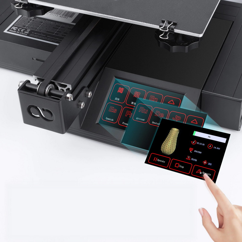 Управление принтером реализовано через цветной тачскрин с удобным пользовательским интерфейсом и поддержкой 4-х языков, включая русский. Загрузка файлов осуществляется через USB. Можно работать и в автономном режиме, с карты памяти SD. Neptune 2 совместим с наиболее популярными слайсерами: Cura, Simplify3D и Repetier-host.