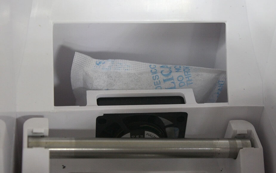 Принцип работы eSun eBOX очень прост: в специальный отсек нужно поместить пакетик силикагеля, после чего встроенный вентилятор прогоняет через него воздух, а силикагель впитывает в себя всю избыточную влагу. Максимальное время просушивания и прогрева составляет 10 часов. Небольшой LCD-дисплей в нижней части корпуса позволяет установить требуемую температуру, настроить вес катушки и выставить таймер.