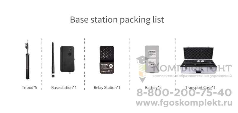 Комплектация                                Штатив х 5 / Базовая станция х 4 / Ретрансляционная станция х 1 / Батарея х 5 / Транспортировочный кейс х 1 / Руководство