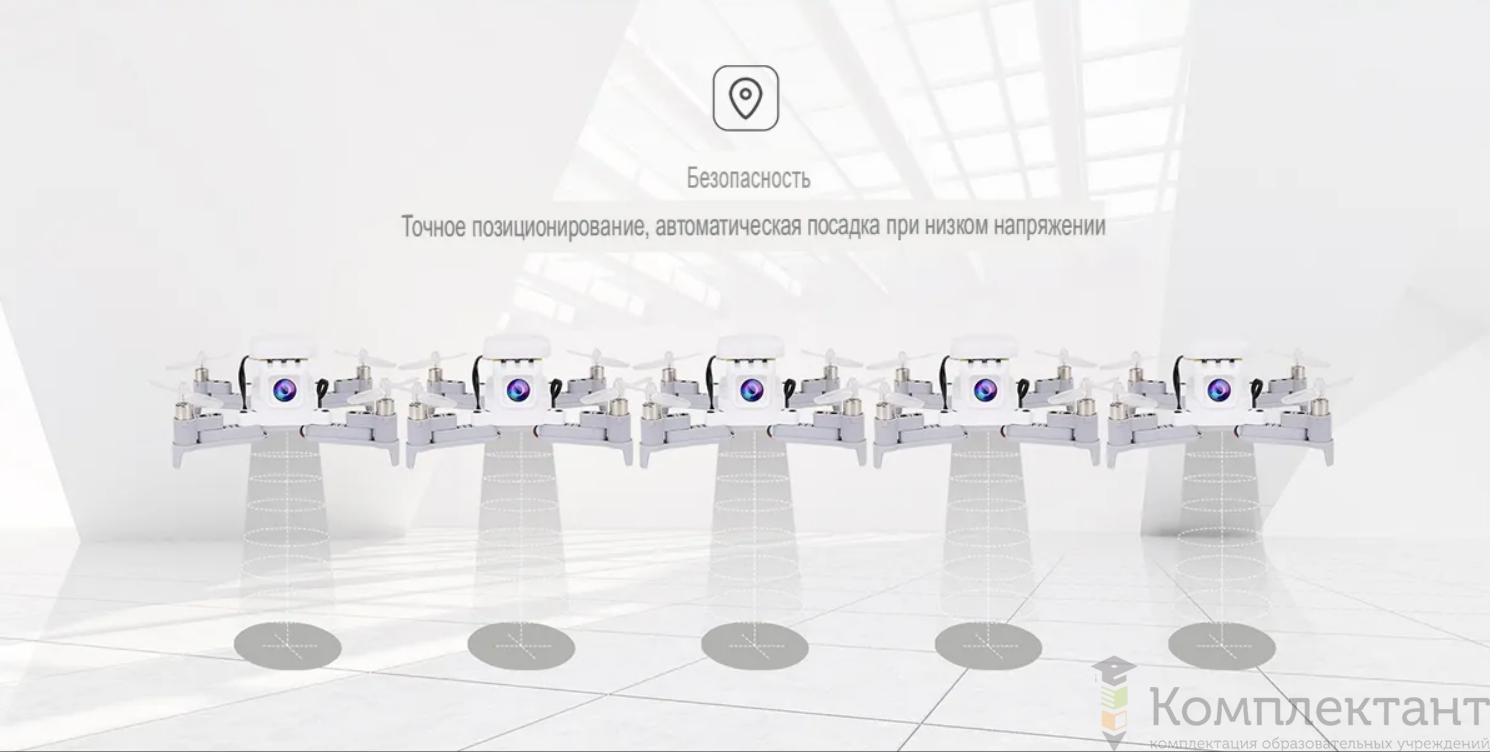 Комплектация Набор дронов -10  шт STEM / Зарядное устройство для литиевых батарей х 10 / Коврик с QR-кодами х 1 / Маршрутизатор х 1 / Литиевая батарея х 16 / Модуль позиционирования х 10 / Фонари х 10 / Соединительный кабель х 10 / Зарядная база х 10 / Кабель микро-USB х 10 / Ключ для пропеллеров х 1 / Инструкция х 1 / Кейс транспортировочный х 1 / Запасные винты (по часовой стрелке / против часовой стрелки по 2 шт.) х 10 / Запасные моторы (по часовой стрелке / против часовой стрелки по 2 штуки) х 8 / Запасные штифты (стандарт: 100 | половина: 10) х 4 / Руководство