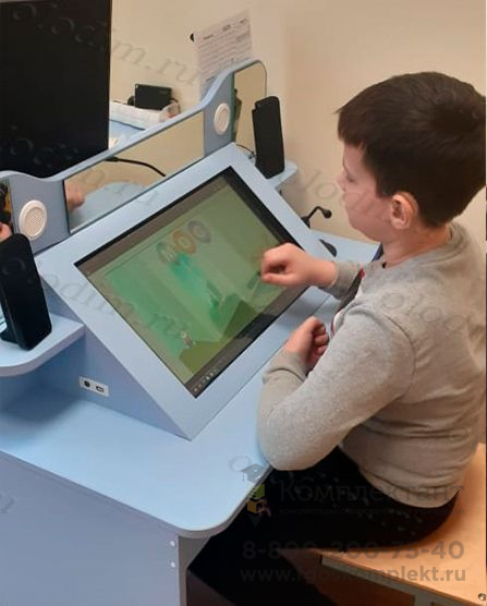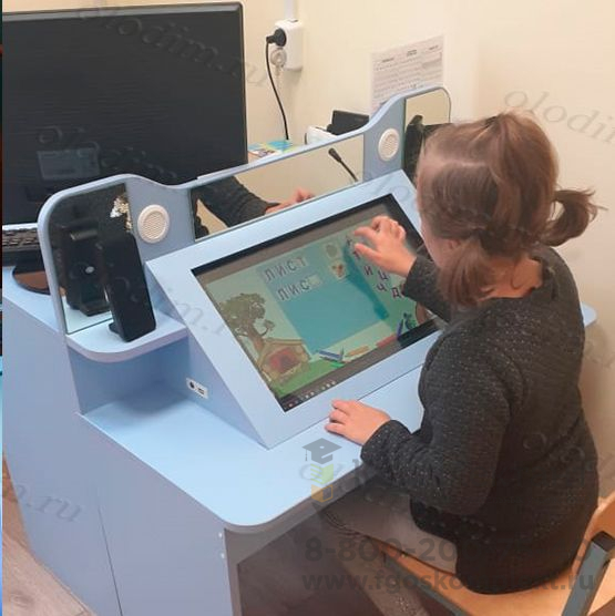 Логопедический стол "Лого" - профессиональное решение для психологов и логопедов, позволяющее на самом высоком уровне проводить как индивидуальную, так групповую работу с детьми с речевыми расстройствами. Работать за ним будет одинаково удобно и педагогу и ребенку. Для детей установлены сенсорные экраны, а для педагога предусмотрен более классический способ управления по средствам клавиатуры и мыши.