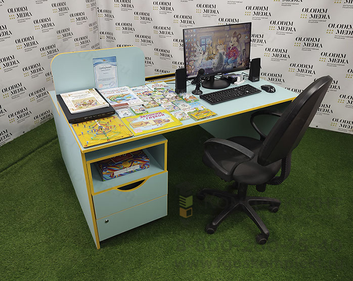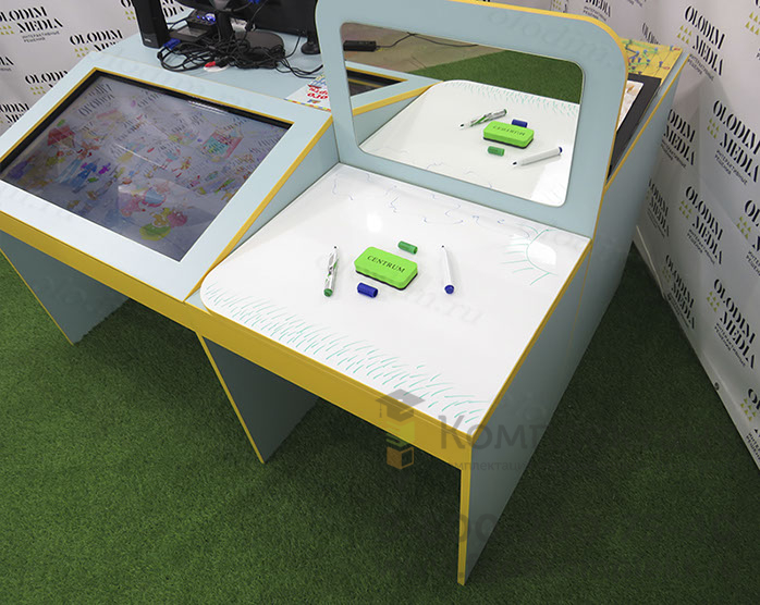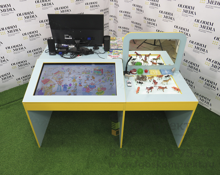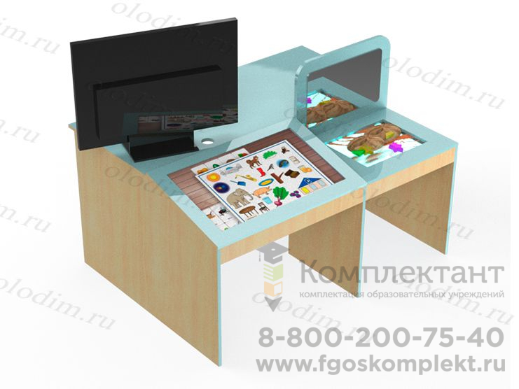Конструкция стола рассчитана таким образом, что с одной стороны располагается рабочее место педагога, а с другой стороны - ребенка. Изображение с компьютера транслируется на оба экрана одновременно, при этом педагог может контролировать процесс, отключая сенсорную функцию экрана у ребенка, когда это необходимо.