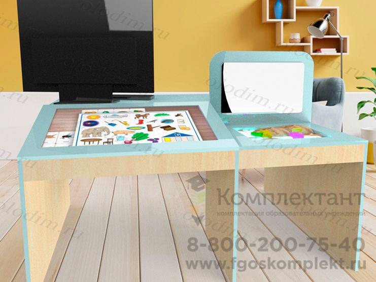 Песочный планшет с различной цветовой подсветкой уже встроен в логопедический стол и служит альтернативой для психотерапии и развитии мелкой моторики у детей. При работе с песком  происходит развитие связной речи; такие методы эффективны в коррекции страхов, тревожности, замкнутости, агрессии, гиперактивности.