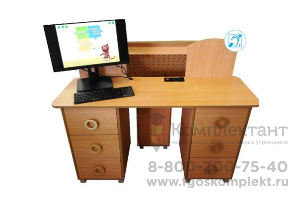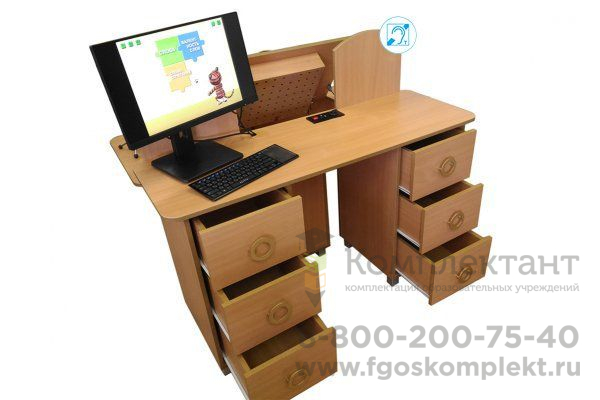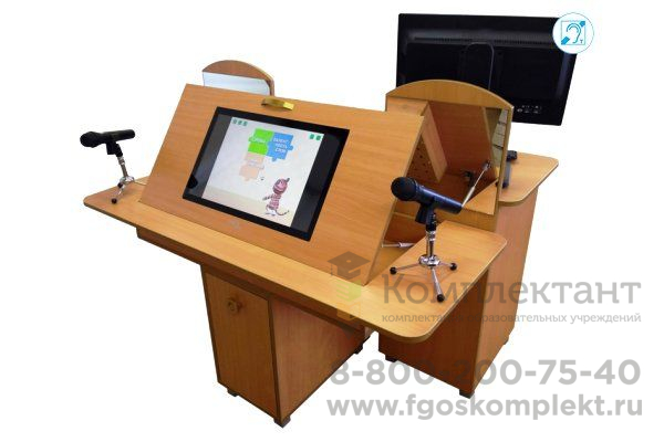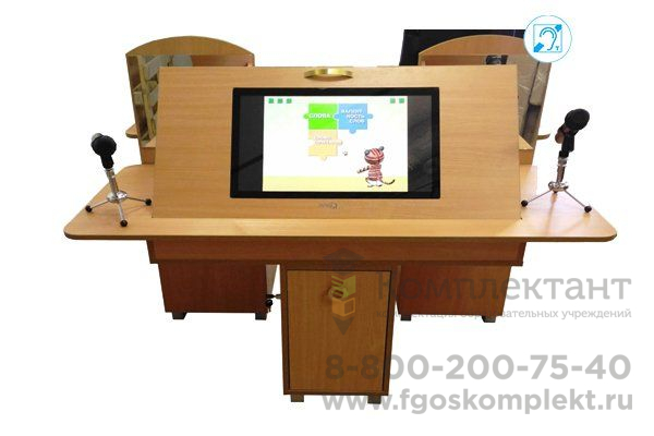 Модуль педагога представляет собой комбинированное рабочее место (с системой вывода изображения на монитор 21.5”), оснащенное выдвижными ящиками, которые позволяют удобно разместить дидактические и методические материалы. Модуль учащегося оснащен встроенной интерактивной системой вывода изображения 23,6” с подъемным механизмом, обеспечивающим плавное поднятие системы. Модуль учащегося может быть использован двумя учениками одновременно.