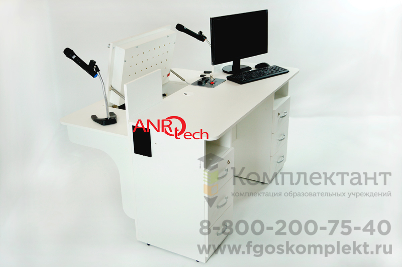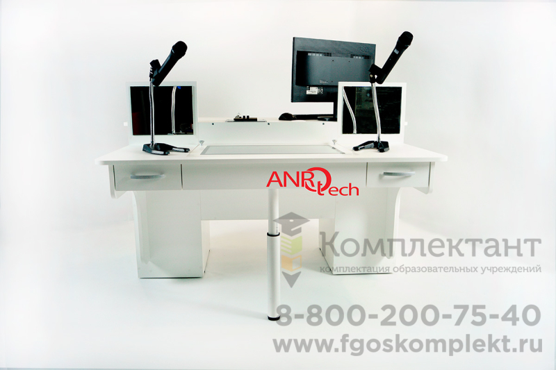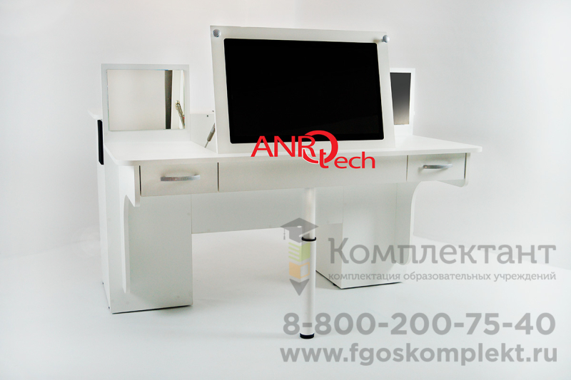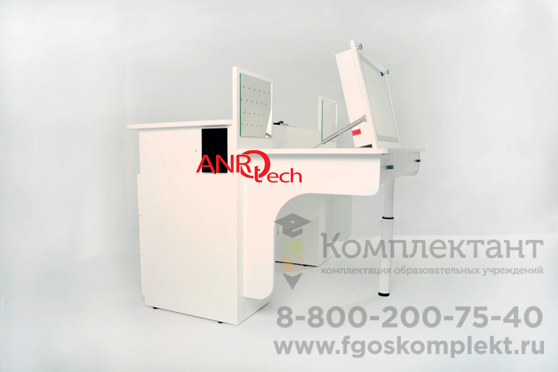 Модуль педагога представляет собой комбинированное рабочее место (с системой вывода изображения на монитор 21.5”), оснащенное выдвижными ящиками, которые позволяют удобно разместить дидактические и методические материалы. Модуль учащегося оснащен встроенной интерактивной системой вывода изображения 23,6” с подъемным механизмом, обеспечивающим плавное поднятие системы. Модуль учащегося может быть использован двумя учениками одновременно.