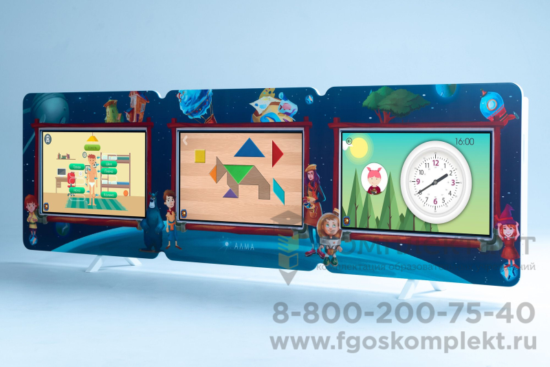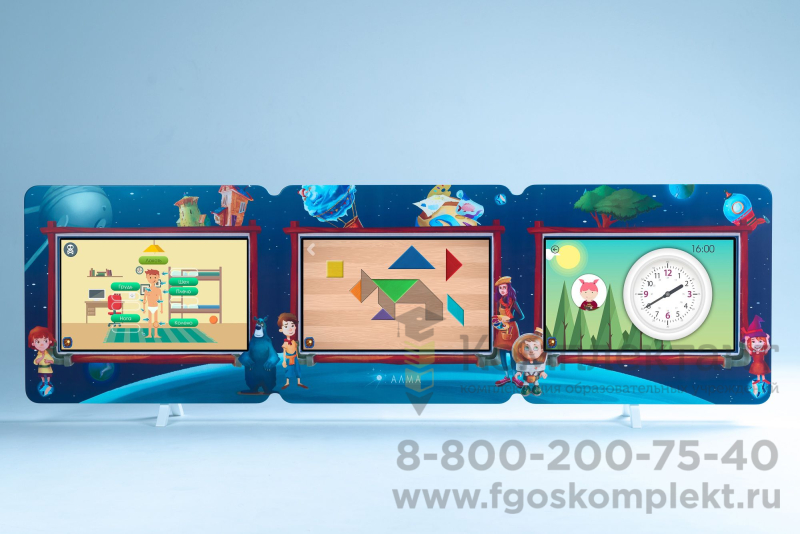 Комплектация: Объединенная художественно оформленная сенсорная панель (диагональ каждого из 3-х мониторов 25 дюймов) Пакет программного обеспечения АЛМА для общеразвивающих и узкоспециализированных занятий: «АЛМА Дошкольное Образование», настольная игра-квест с заданиями для подготовки к школе «5 Островов», раскраска «Оживариум» Три пары наушников