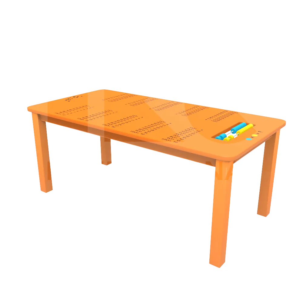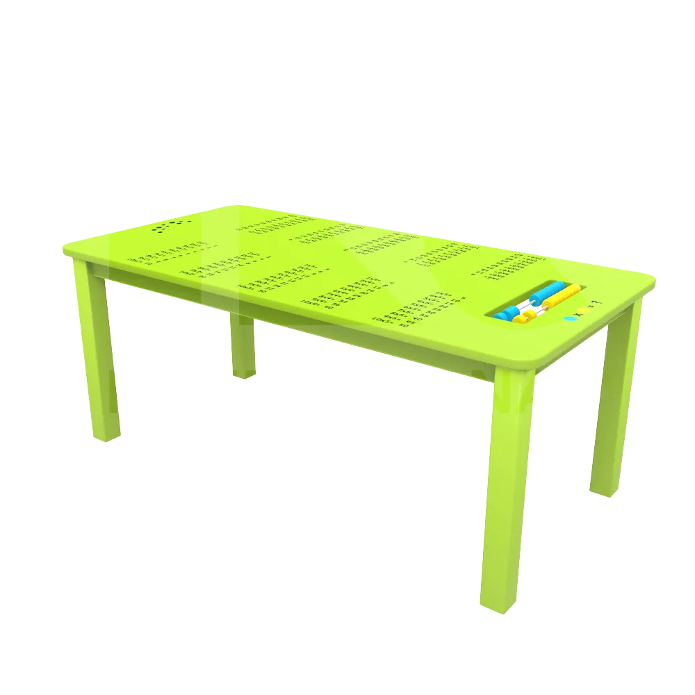 Стол имеет большую, цветную рабочую поверхность для детей, на которой можно есть, играть или заниматься делами. На крышке стола есть таблица умножения от 1 до 10, позволяя детям повторять или изучать математику во время игр. Стол также содержит счеты, для математических упражнений.