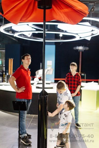 Интерактивный экспонат 7 предназначен для демонстрации распределения волн в воздухе. В верхней части комплекса зафиксирована ткань, скроенная в форме окружности с отверстием посередине. Посетитель крутит ручку, что приводит к вращению ткань (один из любимых экспонатов для фотографий и публикаций в социальных сетях).