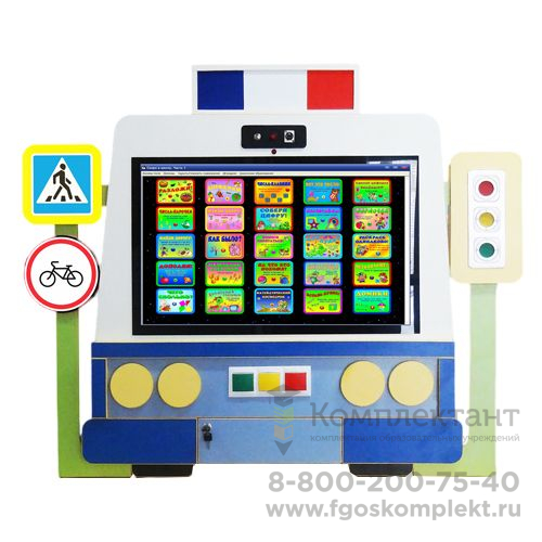 - Сенсорный комплекс-тренажер «Автобот» имеет антивандальный сенсорный multitouch экран диагональю 32”, который встроен в стилизованный яркий корпус, где расположены декорированные макеты дорожных знаков и действующий светофор.