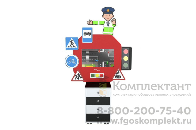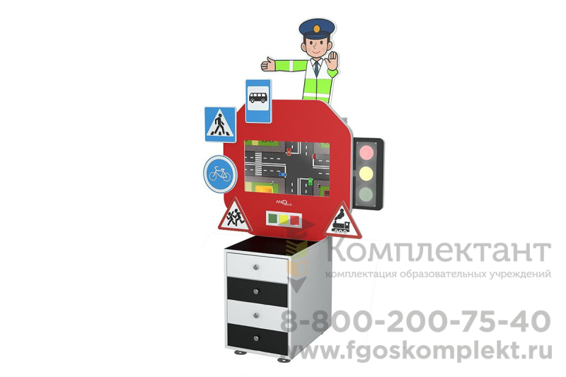Интерактивный развивающий комплекс «ПДД» изготавливается из безопасных экологичных материалов и оснащен выдвижными ящиками для удобного хранения дидактических и учебных материалов. Комплектуется основными знаками ПДД и работающей интерактивной моделью светофора.