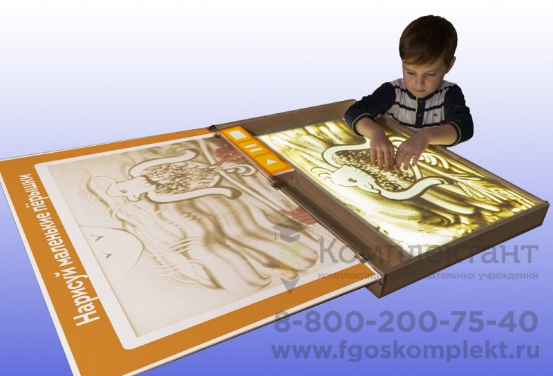 Базовое оборудование –интерактивная песочница«Инновации Детям», на которую легко и быстро устанавливается светящаяся арт-песочница Sandia, на поверхности которой рисуют дети. Белая откидывающаяся доска – это поле для проекции видеозанятий курса, где наш песочный мастер наглядно и доступно демонстрирует тонкости песочного творчества.Арт-песочница Sandiaсоздаёт развивающую предметно-пространственную среду, которая отвечает требованиям ФГОС ДО.