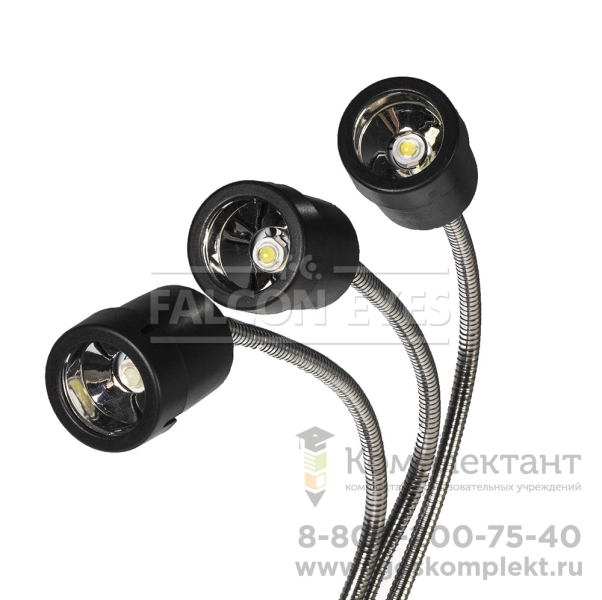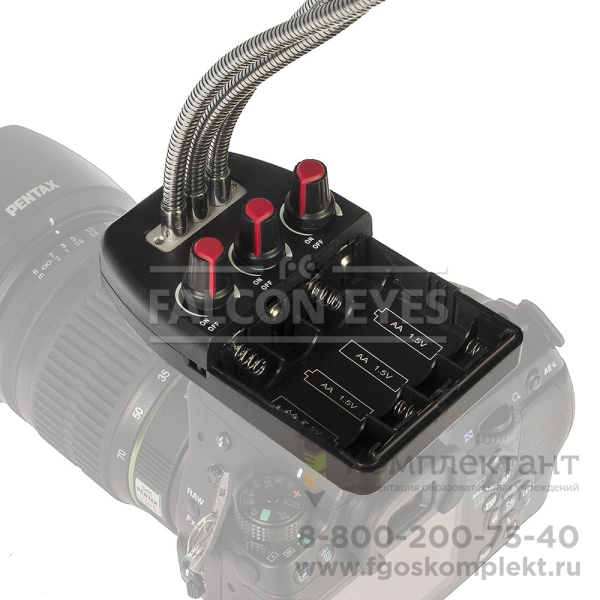 Устройство состоит изтрех точечных (ОТДЕЛЬНО регулируемых, как помощности так иуглу рассеивания светодиодных) осветиетелей мощностью 1 Вт, помещенных нагибких кронштейнах. Блок управлеения устанавливается нагорячий башмак фотоаппарата или любую другую консоль сподобным креплением. Вкомплект поставки входят различные фильтры инасадки для изменения температуры истепени рассеивания светового потока. Прибор работает от4 пальчиковых батареек типаАА.