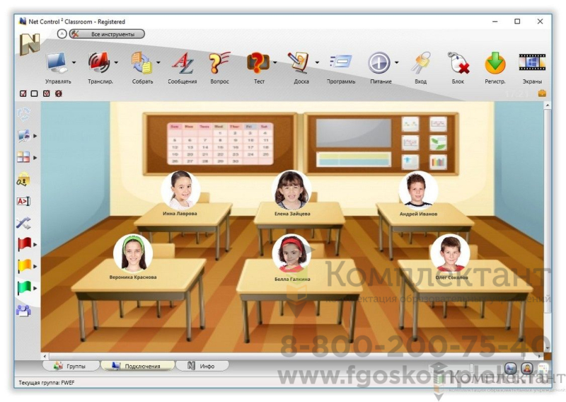 - Совместная работа: воспроизведение мультимедийных файлов синхронно с учащимися, совместный просмотр веб-страниц, возможность открывать необходимые документы и приложения на компьютерах учащихся.
