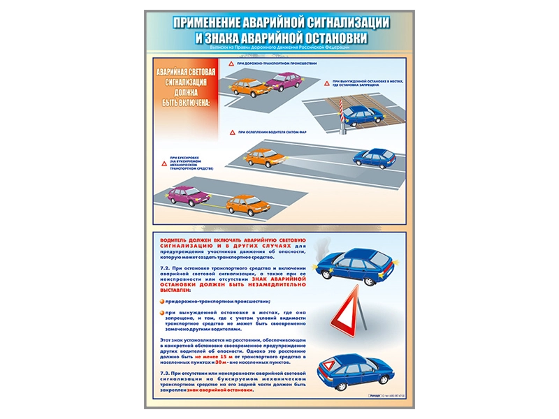 Стенд представляет собой информационную панель, на которой размещены сведения о применении аварийной сигнализации и знака аварийной остановки.