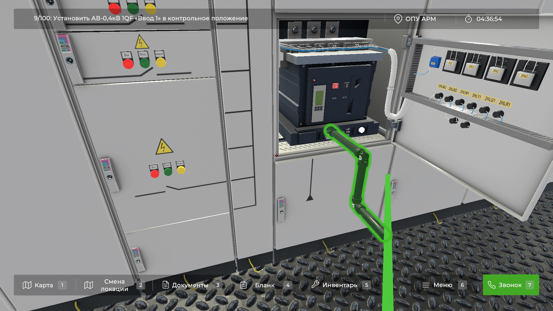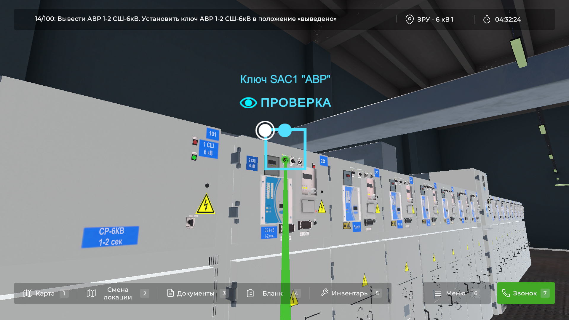 В режиме экзамена пользователь воспроизводит правильную последовательность действий по выводу в ремонт секции шин 10(6) кВ в соответствии с бланком переключений без подсказок и без возможности допустить критическую ошибку.