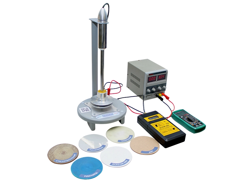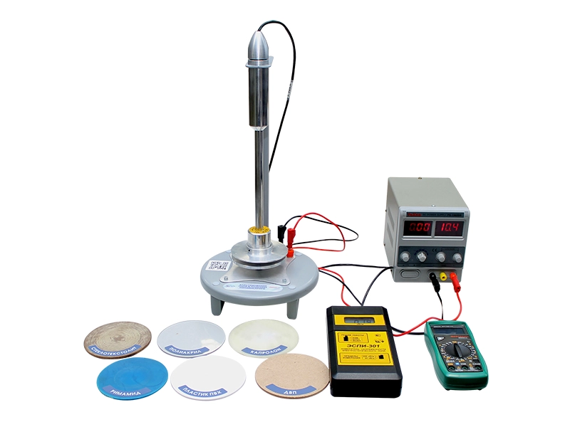 Оборудование конструктивно представляет собой размещенную на основании вертикальную стойку, на которой закреплены параллельно пластины, к которым подводится напряжение, создающее электрическое поле. Величину зазора между пластинами можно изменять. После преобразования с помощью измерительного прибора проводится измерение величины напряжения постоянного тока.