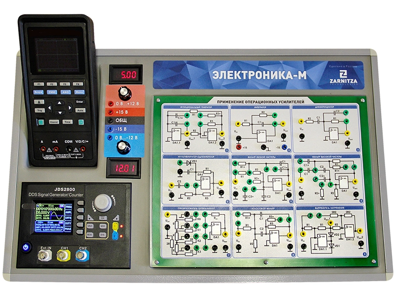 Комплект учебно-лабораторного оборудования "Электроника-М" предназначен для проведения лабораторно-практических занятий по курсам "Основы электроники" и "Схемотехника".