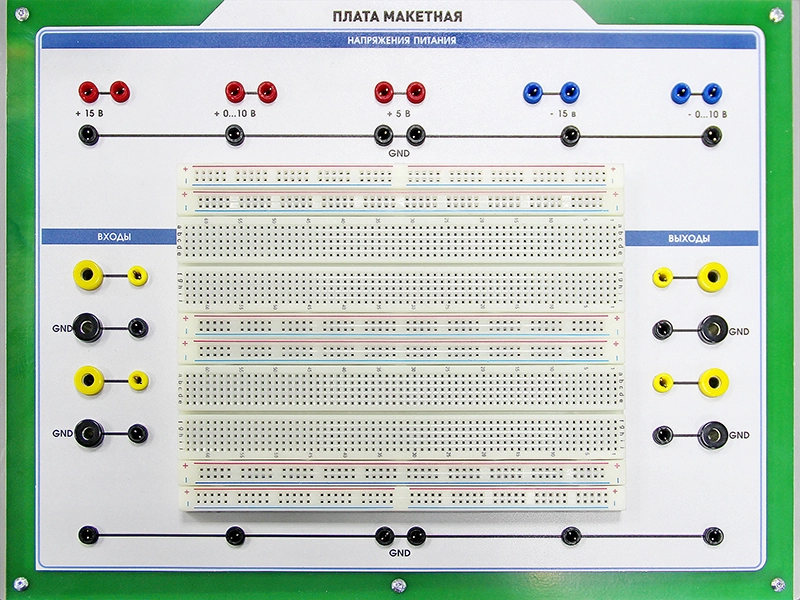 В наборе плат имеется также "Плата макетная", которая позволяет значительно расширить функциональные возможности данного комплекта, которые определяются только ассортиментом комплектующих электрорадиоэлементов. Ассортимент указанных комплектующих можно согласовать с заказчиком при поставке оборудования.