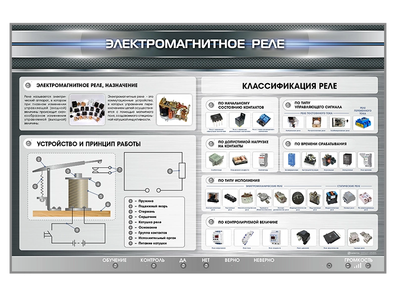 Электрифицированный стенд "Электромагнитное реле" представляет собой полноцветную светодинамическую панель, на которой отображена информация о назначении, принципе работы и классификации реле: по начальному состоянию контактов, по типу управляющего сигнала, по допустимой нагрузке на контакты, по времени срабатывания, по типу исполнения, по контролируемой величине.