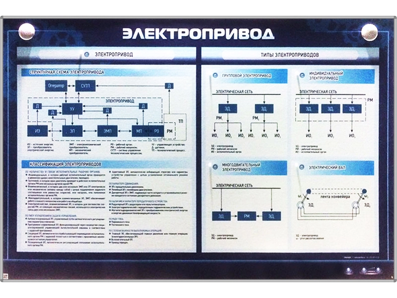 Электрифицированный стенд "Электропривод" представляет собой полноцветную светодинамическую панель, на которой отображена информация о назначении электроприводов, схемах их включения, принципах и алгоритмах работы.