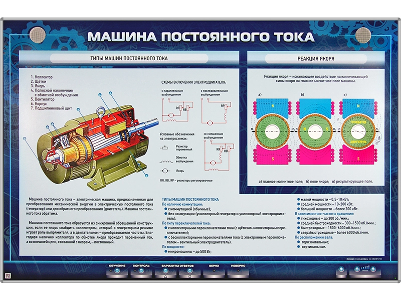 Электрифицированный стенд "Машина постоянного тока" представляет собой полноцветную светодинамическую панель, на которой отображена информация о назначении, принципе работы, схемах включения машин постоянного тока.