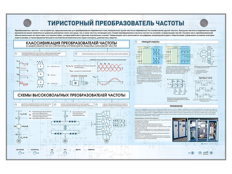 Электрифицированный стенд "Тиристорный преобразователь частоты" представляет собой полноцветную светодинамическую панель, на которой отображена информация о назначении и функциях преобразователя частоты. Представлены схемы включения, принцип работы, классификация, область применения.