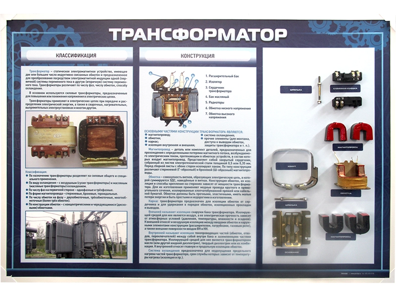 Данный стенд предназначен для получения сведений о конструкции различных видов трансформаторов, их классификации и демонстрации деталей некоторых из них.