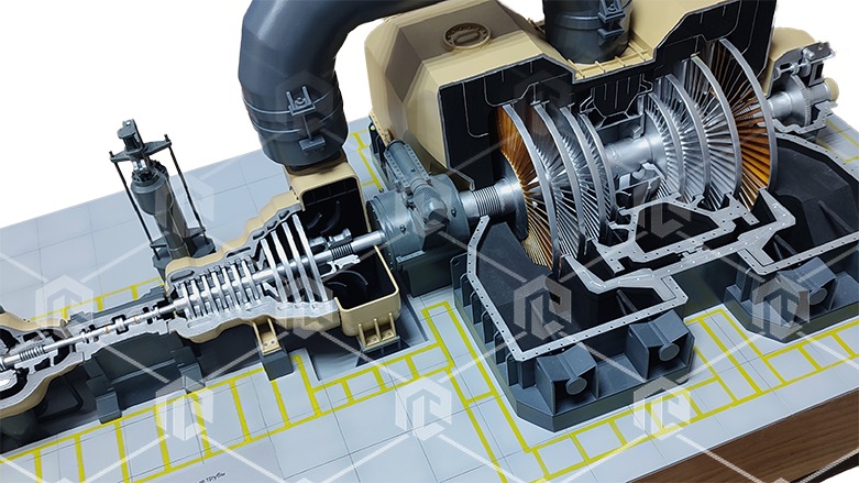 Макет разреза паровой турбины ТЭЦ выполнен из профессиональных листовых и легкообрабатываемых материалов с применением технологий FDM и SLA печати, отдельные элементы созданы на ЧПУ станках позволяет наглядно изучить устройство и элементы паровой турбины ТЭЦ, содержит панель управления подсветкой, а также экспликацию оборудования.