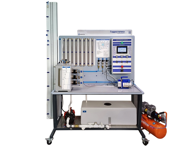 Стенд "Гидростатика" изготовлен в напольном исполнении. Состоит из подвижного металлического основания со столешницей и панелью. На столешнице размещена герметичная испытуемая емкость для создания внутри нее избыточного и вакуумметрического давления. На панели установлены модуль управления и индикации и блок пьезометров. Под столешницей стенда размещается расходная емкость (резервуар) с водой, из которой осуществляется подача воды в систему центробежным насосом. Избыточное давление воздуха создается компрессором. Вакуум создается при помощи вакуумного насоса. В состав стенда входит панель дополнительного пьезометра, которая крепится к раме стенда.