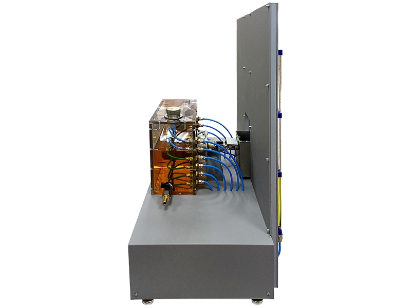 Конструктивно лабораторный стенд комплекта выполнен в настольном каркасном исполнении. На каркасе лабораторного стенда располагается прозрачная ванна со смазывающей жидкостью, в которой закреплен блок подшипников для вала и приводного мотора-редуктора. Внутри ванны размещен корпус подшипника с точками отбора давления, расположенными по окружности корпуса. В ванну через уплотнение входит вал, приводимый от двигателя с регулируемой частотой вращения. Корпус гидродинамического подшипника имеет возможность изменения зазора с шейкой вала от нулевого до номинального, моделируя процесс "всплытия вала".