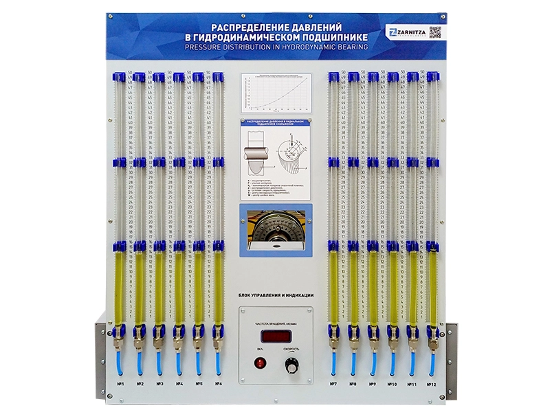 Комплект учебно-лабораторного оборудования "Распределение давлений в гидродинамическом подшипнике" (далее – стенд) предназначен для изучения работы гидродинамического подшипника, определения соотношения давлений в разных точках гидродинамического подшипника, расположенных по окружности корпуса, при изучении курсов "Детали машин" и "Теоретическая механика".