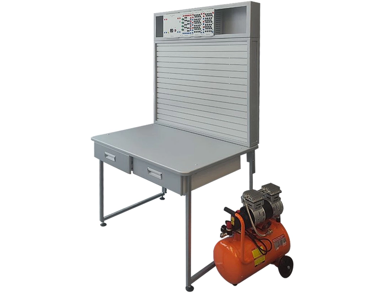 Стенд состоит из лабораторного стола с выдвижными ящиками. На столе установлена монтажная плита, предназначенная для закрепления пневматических элементов. В верхней части стола закреплена монтажная рама для установки электронных блоков. На нижней части рамы стола закреплен поддон для установки лабораторного компрессора.