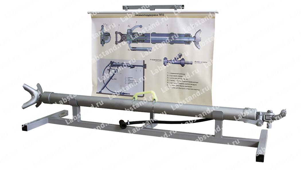 Описание: Стенд-тренажер представляет собой пневмоподдрежку, подготовленную для разборки и сборки, на металлическом основании с цветным плакатом формата А1, иллюстрирующим устройство и принцип действия пневмоподдержки. Металлическое основание выполнено из профильного металлопроката и покрыто защитной порошковой эмалью. Пневмоподдержка представляет собой инструмент, использующийся для облегчения работы с пневматическим перфоратором. Пневмоподдержка позволяет поднять его на необходимый уровень и закрепить его в этом положении на протяжении всего процесса работы. Пневмоподдержка, входящая в состав стенда-тренажера, предназначена исключительно для сборочных и разборочных работ, исключающих её запуск и эксплуатацию на рабочих режимах.