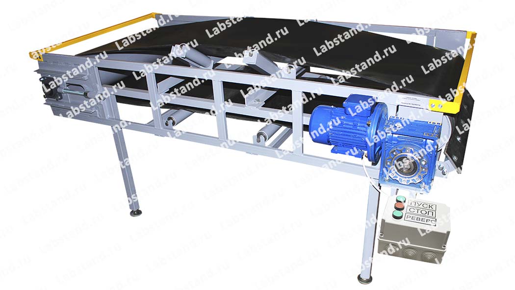 Описание: Стенд-тренажер представляет собой действующий стационарный прямой желобчатый ленточный конвейер, адаптированный для учебного процесса. Конвейер должен состоять из рамы, выполненной из профильного металлопроката и покрытой защитной эмалью. Рама должна быть оснащена регулируемыми опорами. На раме должны быть закреплены: ведущий барабан; ведомый барабан, оснащенный устройством для регулировки натяжения ленты; верхние поддерживающие ролики, задающие желобчатую форму ведущей ветви ленты; нижние прямые ролики. На валу ведущего барабана должен быть установлен мотор-редуктор. Лента, используемая в конвейере должна быт гладкая, резинотканевая. Управление мотор-редуктором должно осуществляться с помощью пульта управления. Пульт управления должен иметь кнопки «Пуск», «Стоп» и «Реверс».