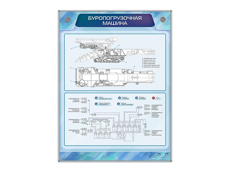 Электромеханический стенд представляет собой информационную панель с подвижными элементами. На стенде представлена информация об устройстве и принципе работы элементов буропогрузочной машины. В конструкцию учебного оборудования интегрированы светодиодные элементы, имитирующие направление движения гидравлической жидкости в гидросистеме и подвижные элементы, демонстрирующие работу элементов буропогрузочной машины. Также в нем присутствуют магниточувствительные сенсоры для управления стендом при помощи интерактивного воздействия приемо-передающих устройств.