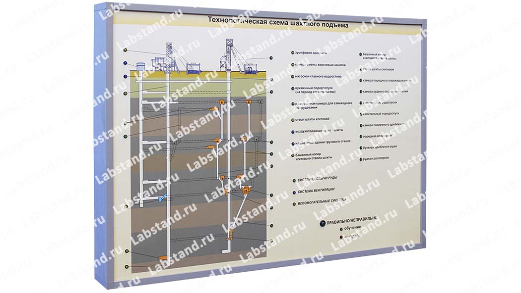 Описание: Стенд представляет собой жёсткую лицевую панель из МДФ толщиной 8 мм, в пластиковом каркасе толщиной 90 мм. На лицевую панель наклеена полимерная подложка с цветным изображением технологической схемы шахтного подъема. Внутри каркаса расположен контроллер управления логикой стенда. С целью наглядной иллюстрации принципа работы схемы в лицевой панели установлены динамическая светодиодная подсветка и магнитные сенсоры для реализации режимов «обучения» и «контроля». В режиме «обучения» при выделении одного из элементов технологической схемы загорается светодиод напротив соответствующего наименования элемента. В режиме «контроля» учащийся должен сам сопоставить наименование элемента с его изображением на технологической схеме.
