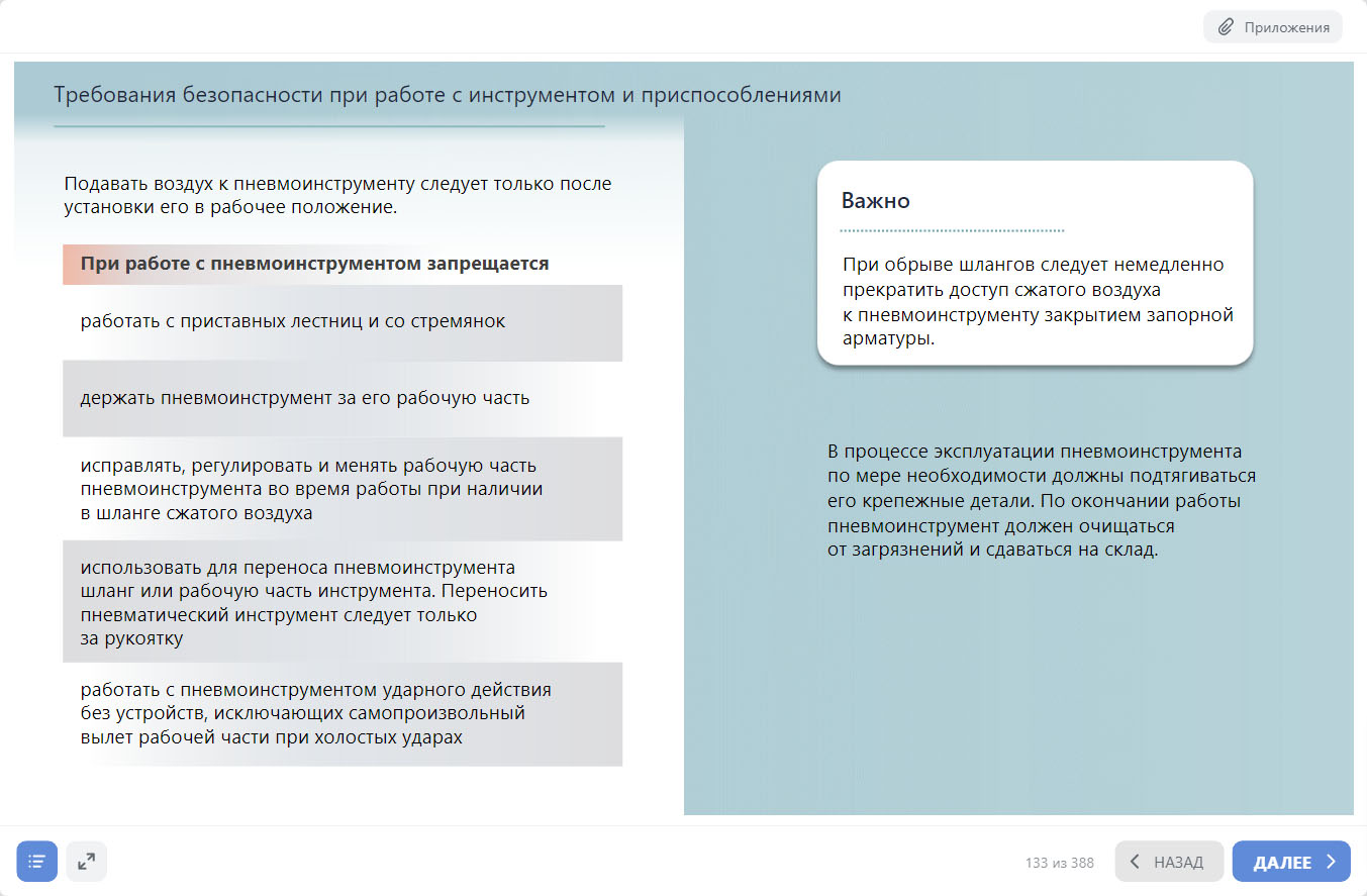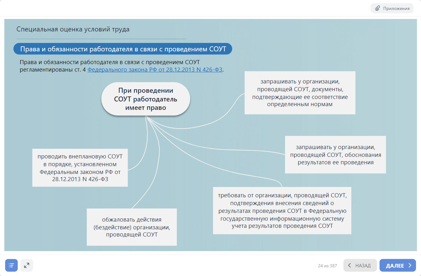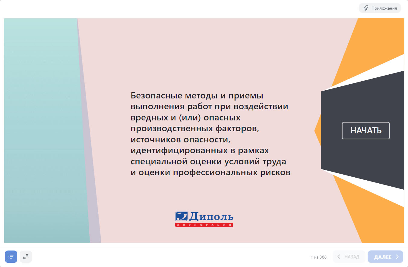 Курс соответствует программе обучения безопасным методам и приемам выполнения работ при воздействии вредных и (или) опасных производственных факторов, источников опасности, идентифицированных в рамках специальной оценки условий труда и оценки профессиональных рисков, продолжительностью не менее 16 ч (п. 46, б, Постановление Правительства РФ от 24.12.2021 N 2464).