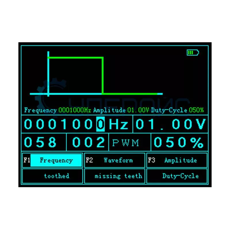Типы выходных сигналов постоянная волна, прямоугольная волна, синусоидальная волна, сигнал рабочего цикла, зубчатая волна