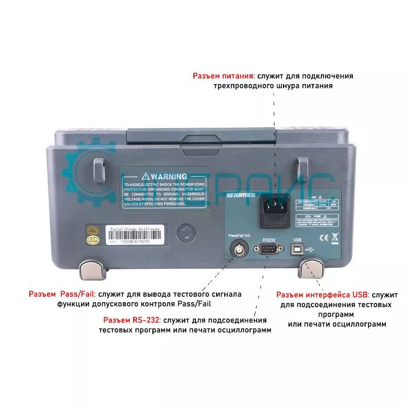 Прибор оборудован тремя разъемами передачи данных: Pass/Fail, USB, RS-232, которые служат для вывода тестового сигнала и подсоединения тестовых программ или печати осциллограмм к компьютеру.