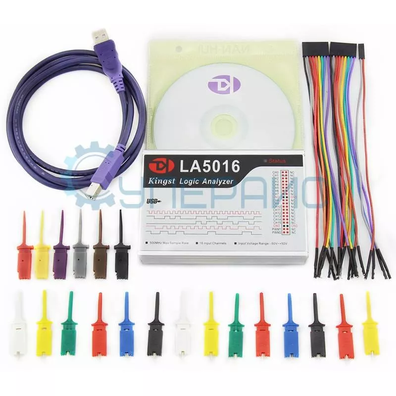 Логический анализатор KINGST LA5016 - это портативный прибор с питанием по USB, обладающий широкими возможностями по записи и анализу цифровых сигналов. Он удобен в применении и имеет продуманный, интуитивно понятный интерфейс управления. Для использования логического анализатора необходимо скачать и установить на компьютер специальное программное обеспечение для работы с устройством, позволяющее проводить динамический анализ полученной информации с каналов передач. Логический анализатор KINGST LA5016 имеет 16 входных каналов с частотой дискретизации до 500 МГц, а также буфер длиной 1Гб выборок на канал, обеспечивающий высокую точность временных измерений довольно больших потоков данных. Прибор поставляется с необходимым набором шлейфов и зажимов для подключения к объекту тестирования.