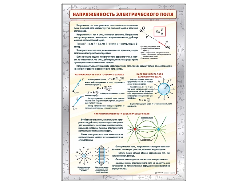Стенд представляет собой информационную панель, на которой изображено описание основных понятий напряженности электрического поля.
