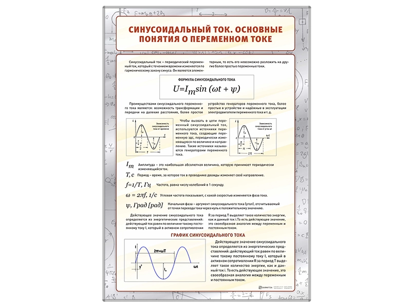 Стенд представляет собой панель, на которой отображен синусоидальный ток и основные понятия о переменном токе.