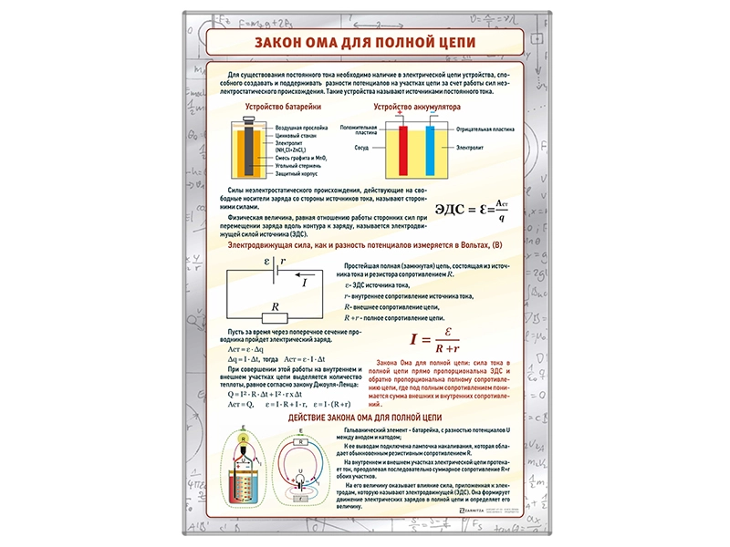 Стенд представляет собой информационную панель, на которой изображено описание основных понятий закона Ома для полной цепи.