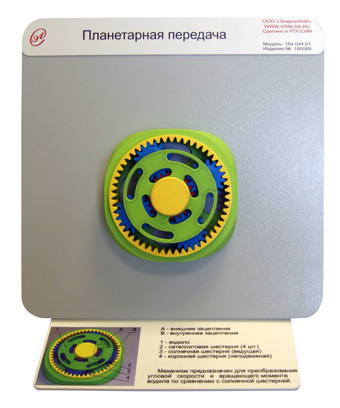 Демонстрационная модель "Планетарная передача" предназначена для демонстрации преобразования угловой скорости и вращающего момента водила по сравнению с солнечной шестерней.