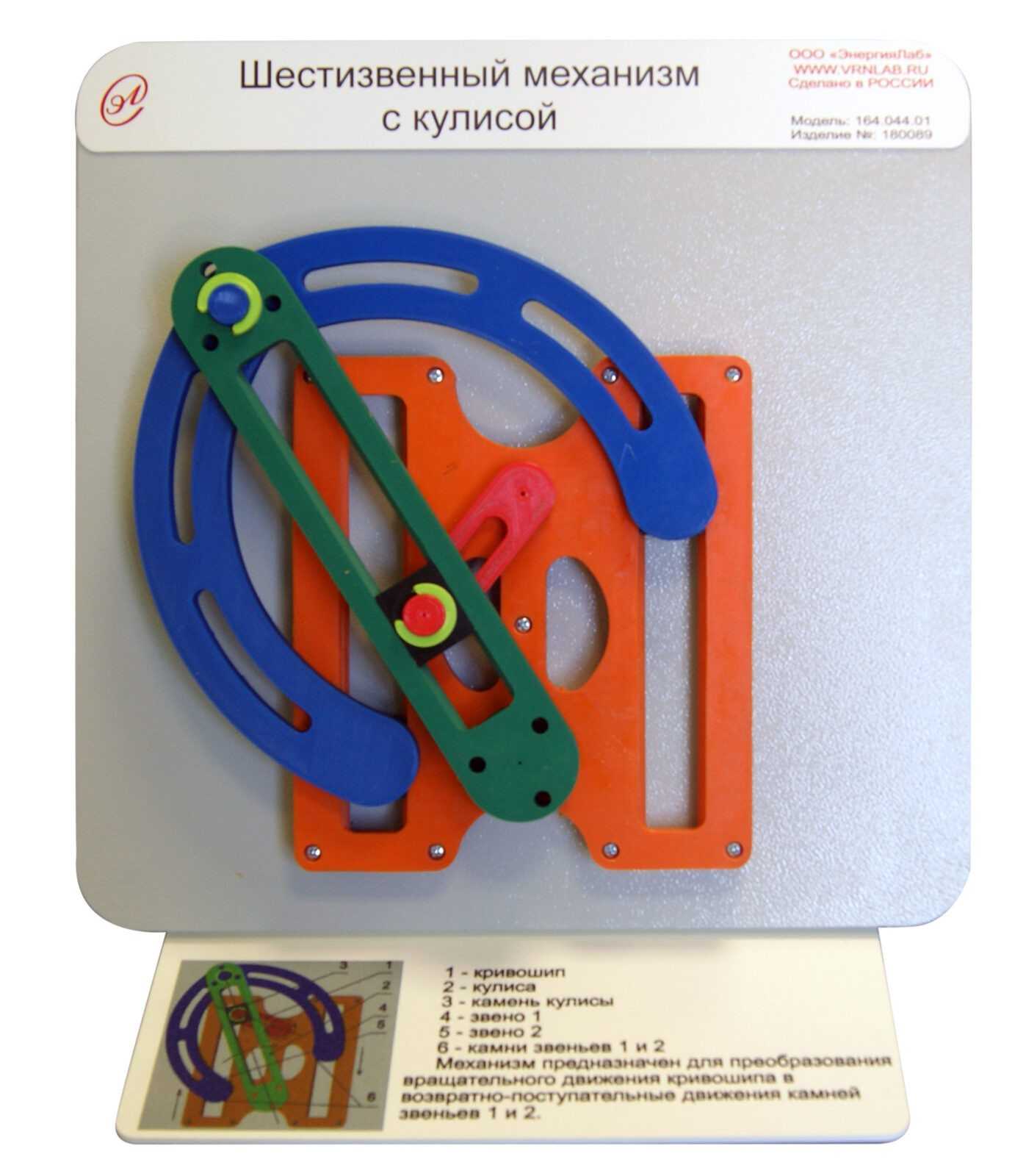 Может использоваться как наглядное пособие для обучения при чтении лекций и демонстрация шестизвенного механизма с кулисой.