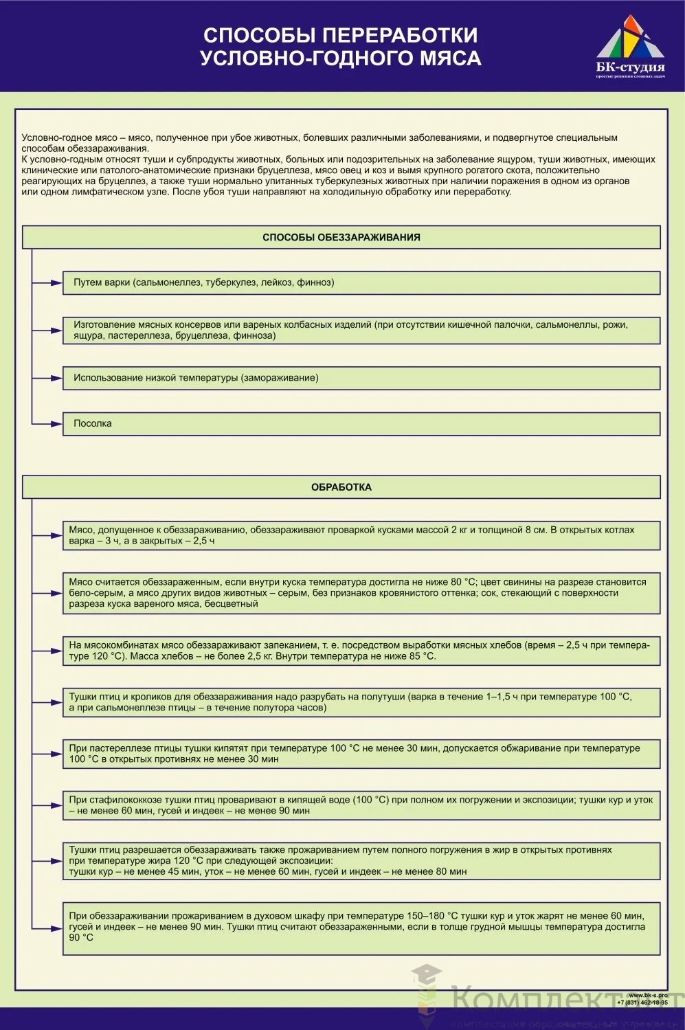 На стенде представлена текстовая информация об условно-годном мясе, способах его обеззараживания и обработки.