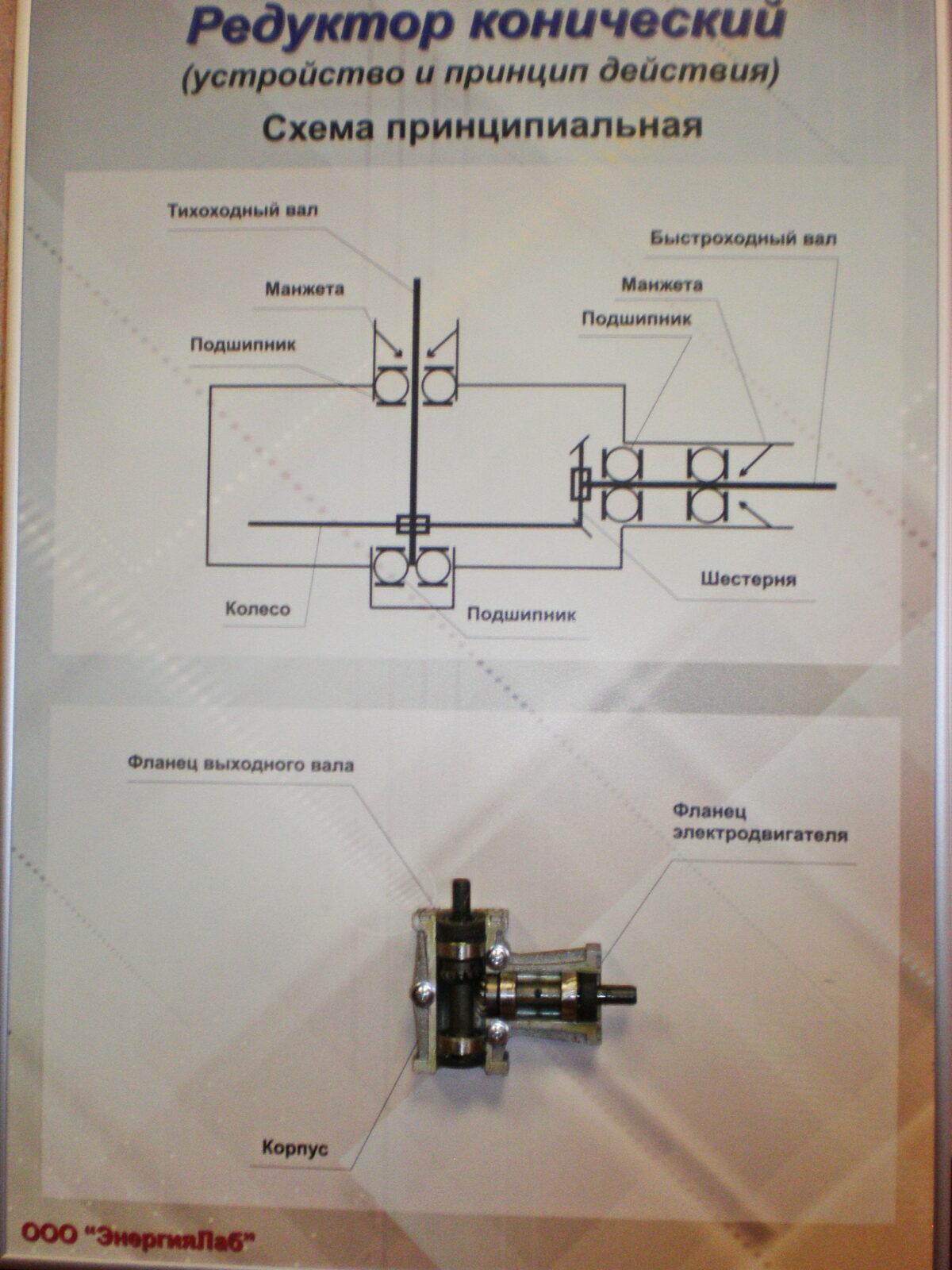Планшет позволяет изучать устройство конического редуктора, делать измерения геометрических параметров зацепления определять передаточное отношение методами вращения вала и через числа зубьев колес.