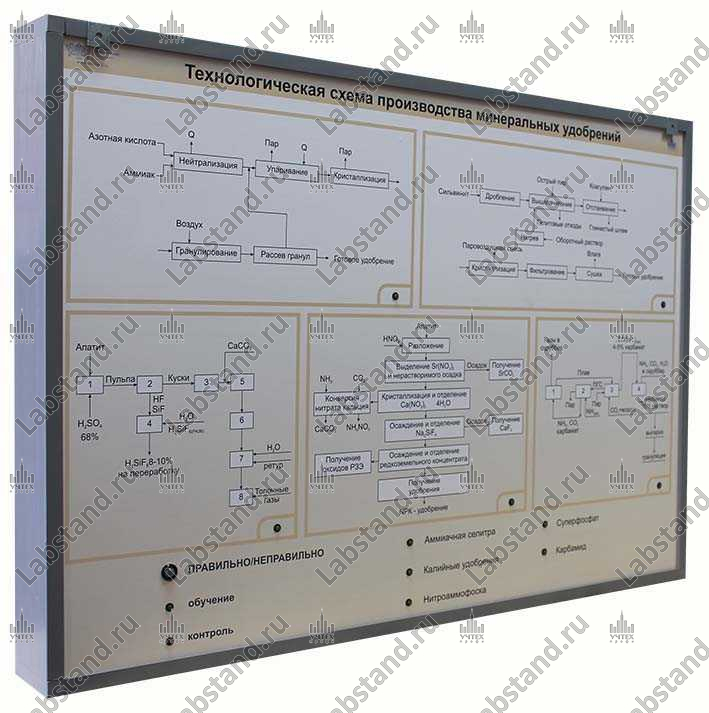 Назначение: Стенд-планшет предназначен для изучения технологической схемы производства минеральных удобрений в учебном курсе «Почвоведение».