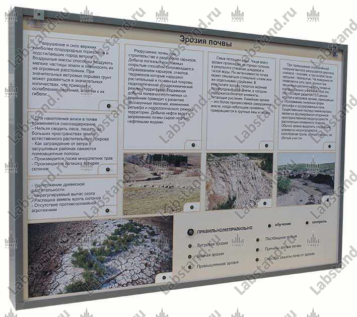 Назначение: Стенд-планшет предназначен для изучения типов, причин и методов борьбы с эрозией почвы в учебном курсе «Почвоведение».