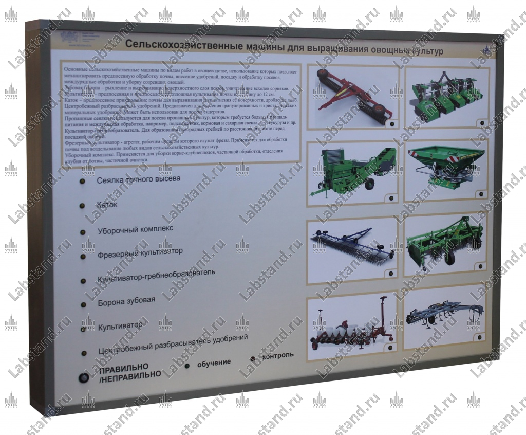 Назначение: Стенд-планшет предназначен для изучения сельскохозяйственных машин, используемых в технологии выращивания овощных культур.